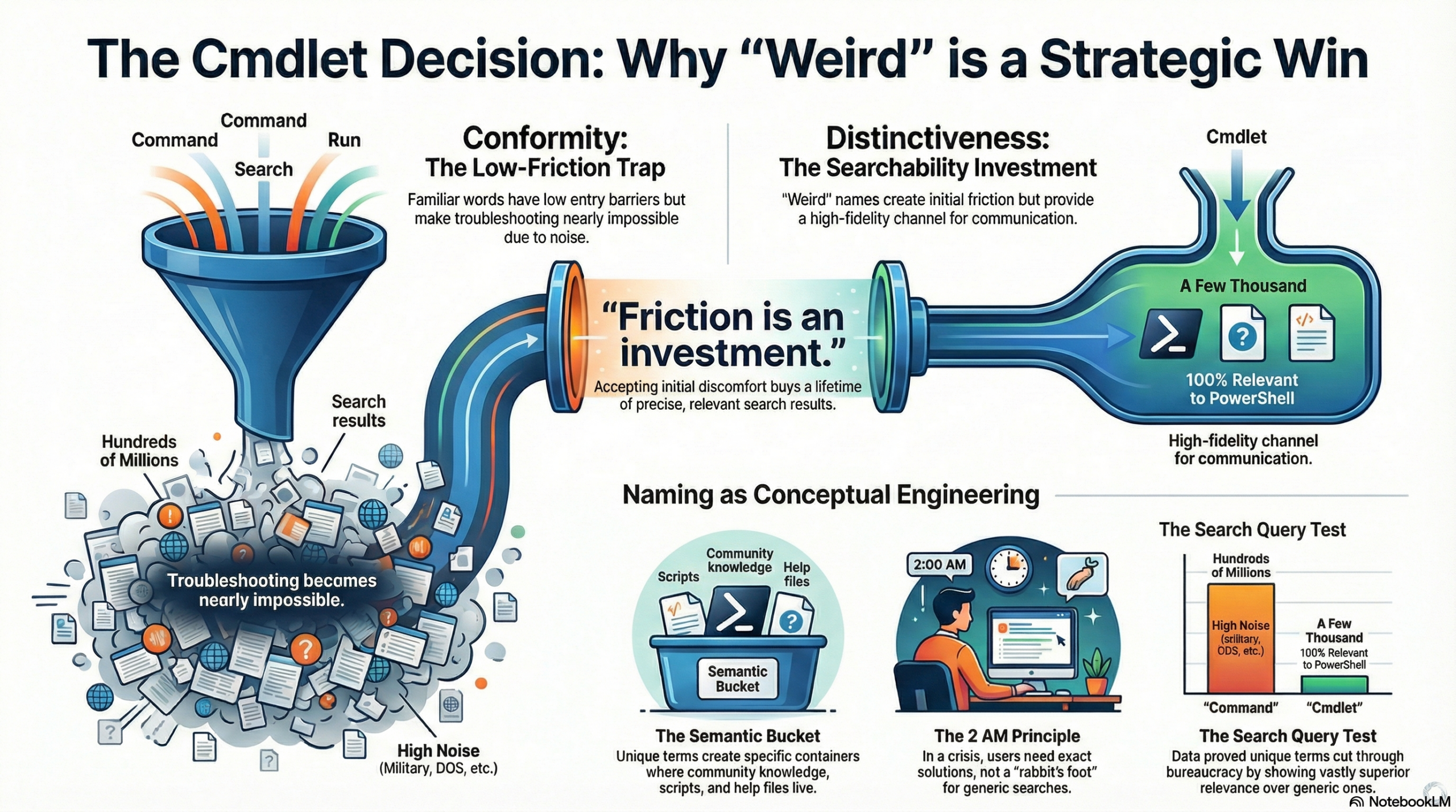 1️⃣ Distinctiveness beats conformity. “Cmdlet” wasn’t familiar, but it created a clear, searchable semantic bucket — a friction worth investing in.